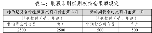 胶版印刷纸期权合约中,合约月份涉及的标的期货持仓量阈值为5000手(单边)。