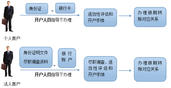 第一步:个人客户请准备好本人身份证、银行卡,法人客户提供公司相关身份证明文件和尽职调查资料,联系交子期货网点,当面办理开户手续。个人客户也可通过互联网开立期货账户。