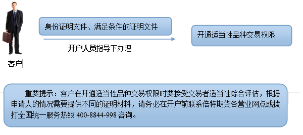 第一步:请您联系交子期货网点,提供满足条件的证明材料,申请开通适当性品种交易权限。