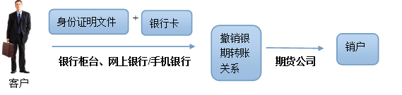 第一步:客户携带身份证明文件、银行卡到相应银行网点,或自行通过网上银行/手机银行取消银期转账关系。