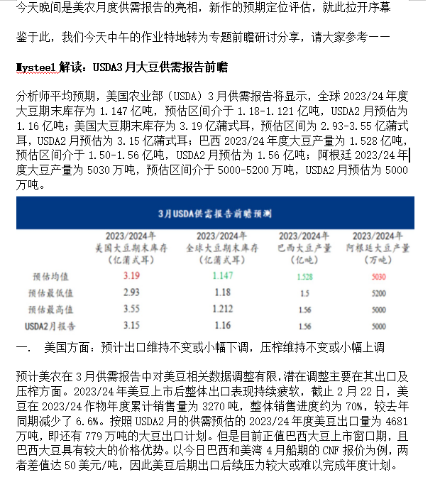 午间直击——Mysteel解读:USDA3月大豆供需报告前瞻